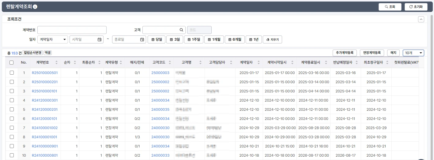 렌탈계약/출고처리- 계약 등록과 동시에 자동 출고처리- 견적복사 및 등록한 견적으로 계약전환 가능- 고객 , 자산별 계약 조회 가능- 진행중인 계약의 연장 계약, 추가 계약, 계약해지 가능- 계약된 물건에 대한 월별 청구 일정,물건별 청구 일정이 자동 계산되어 확인 가능