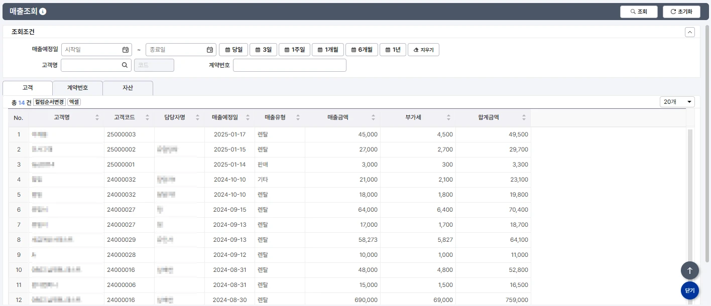 매출관리- 고객계약, 자산별 매출 일정 조회 가능- 매출 회차별 매출 금액 수정 가능- 매출별 수납 조회 가능- 월별, 일별, 고객별, 매출 집계 조회 가능- 거래처, 계약별 수납 등록이 가능하며, 부분 수납 입력도 가능- 미수 금액에 대한 관리 가능